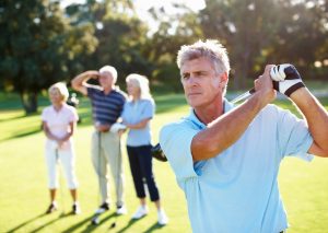Smart, mature golfer swinging